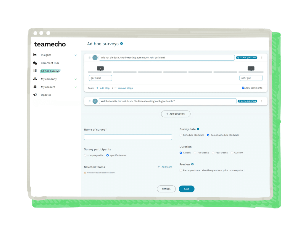 Deswegen kannst du zusätzlich zu unserem Stimmungsbarometer auch selbst individuelle Einmal-Befragungen gestalten. Thema, Start und Dauer bestimmst du. Alles Technische erledigt teamecho für dich.