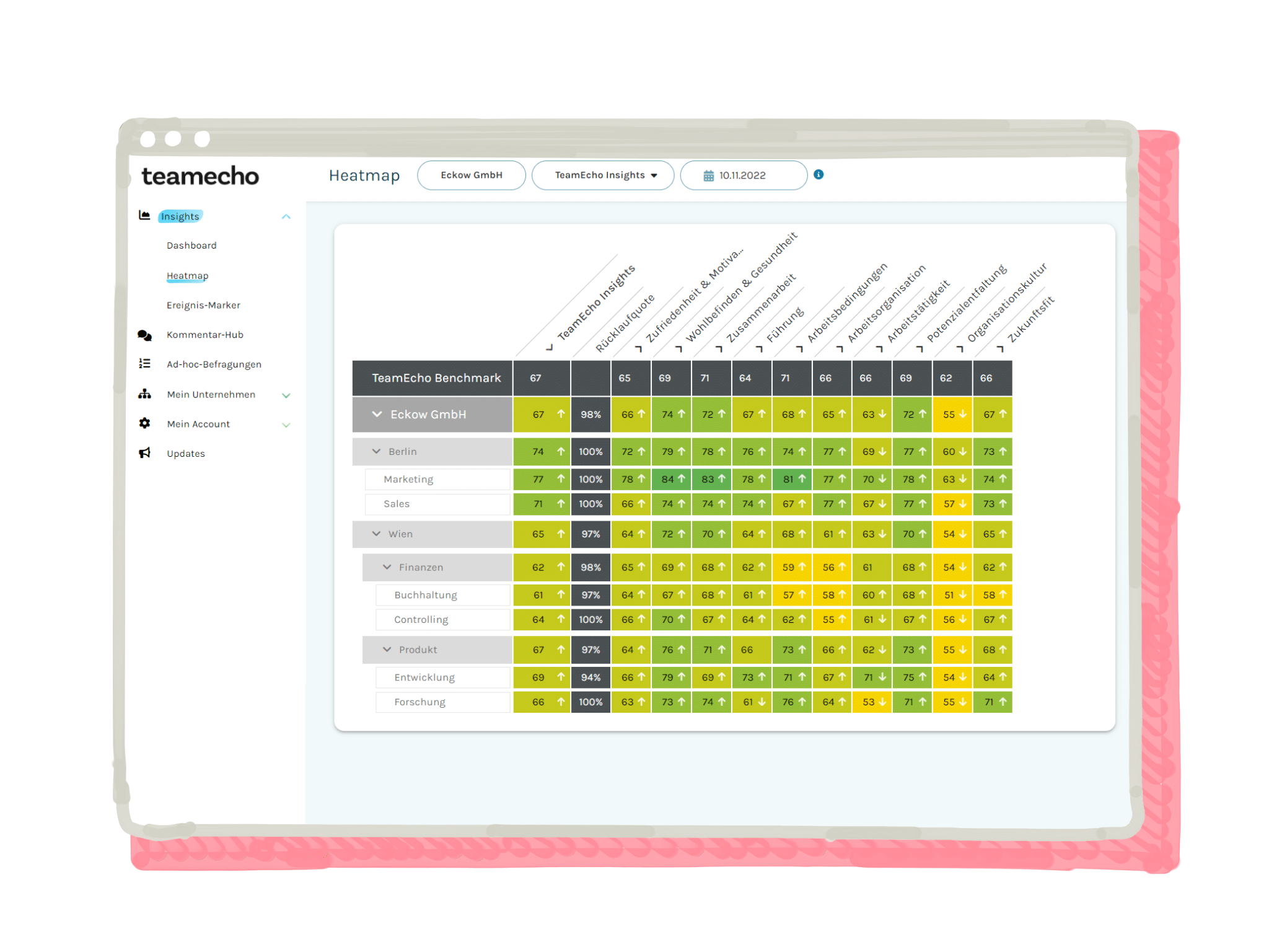 In der Heatmap hast du alle Teams und Abteilungen im direkten Vergleich. Und erkennst auf einen Blick, auf welchen Themen dein Fokus liegen sollte.